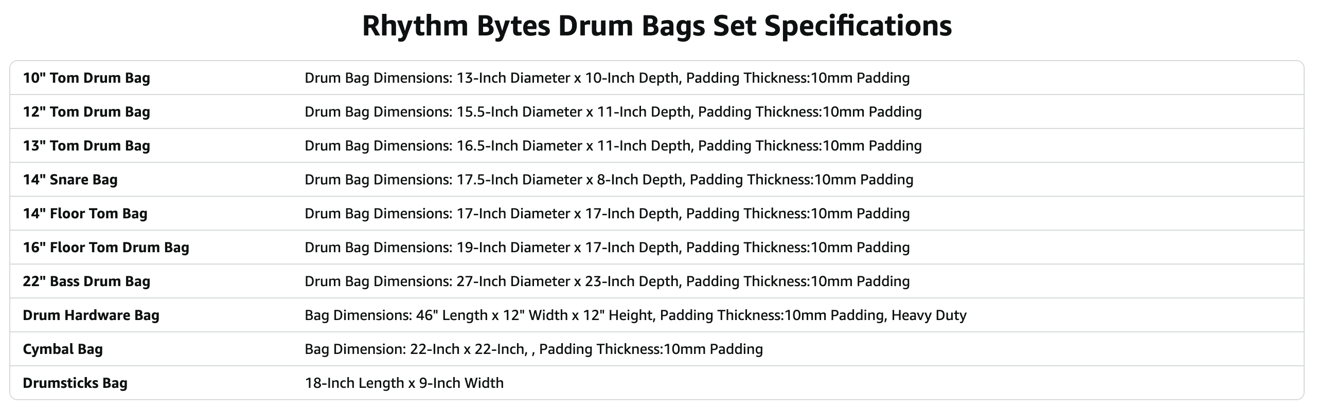 - Padded Protection for Your Drums: Our bags feature plush 10mm padding, ensuring a snug and secure fit for your drums. Whether you have large or small drums, they'll enjoy the cushioned comfort and reliable shield. Even the drum Hardware Bag and Cymbals bags come with 10mm thick padding, providing a well-padded safeguard for your valuable gear.